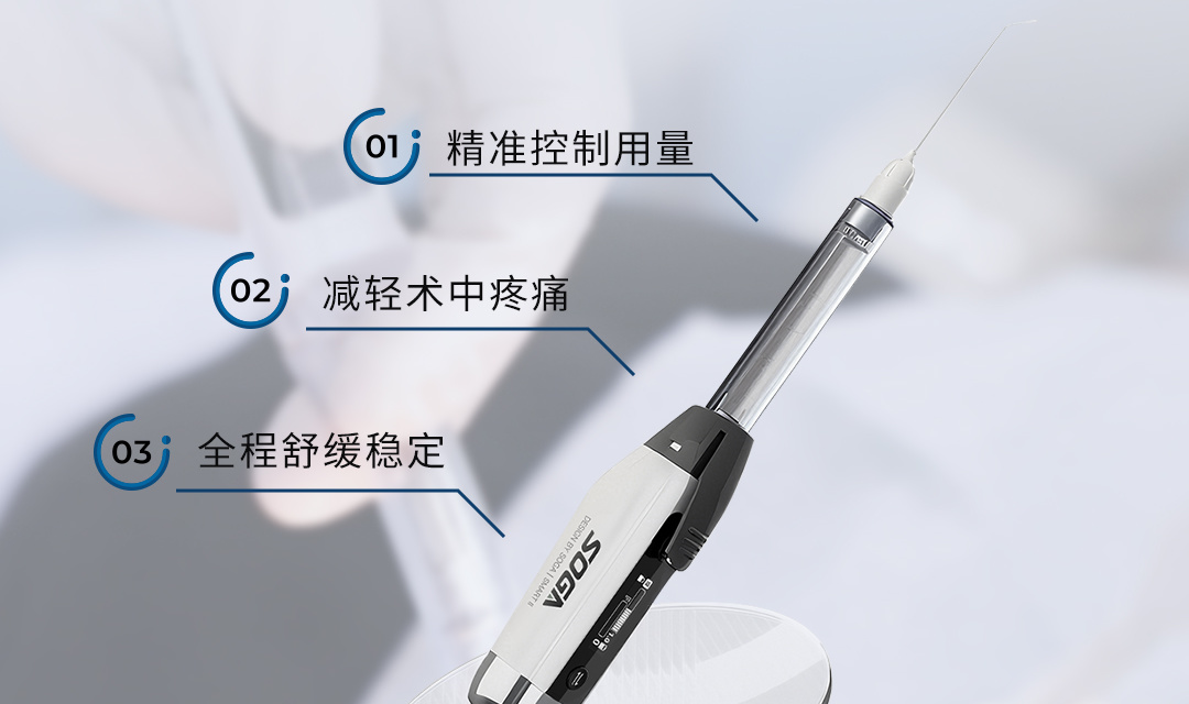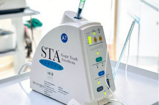在麻醉技术方面,国贸口腔率先引进了智能控制的局部麻醉设备,口腔STA无痛麻醉仪,采用动态压力传感技术(DPS),实时监测并调节麻醉药输出压力。通过巡航控制功能,它能保持稳定、缓慢的给药速度,使药物进入组织的速度与吸收速度相匹配,减少局部压力,从而避免传统注射的疼痛感。